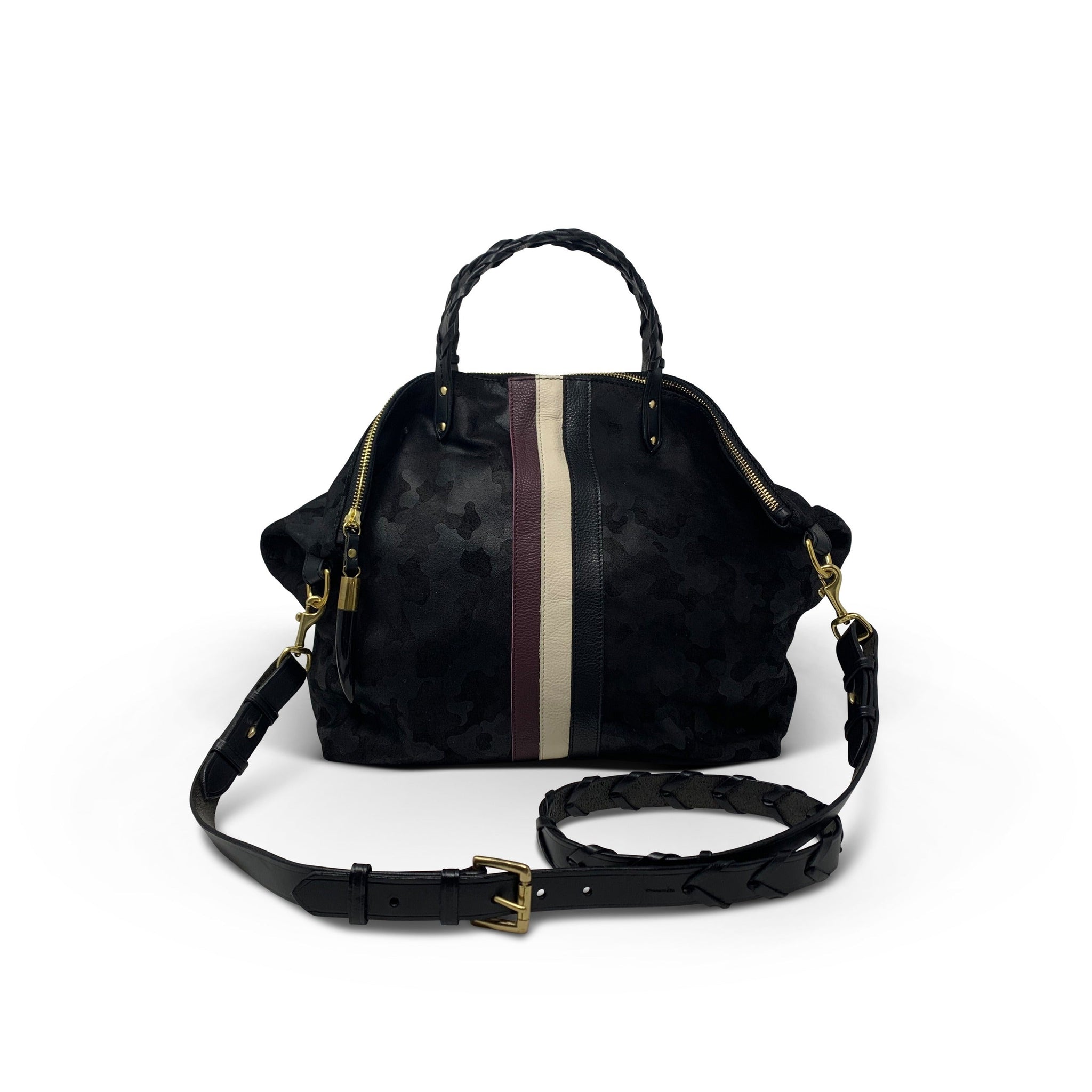 This gorgeous black on black camo is so chic it's crazy, and oh so cool on our Dylan Holdall! With a braided rein strap, (inspired by horse's reins) in black bridle leather, super versatile adjustable crossbody strap, maroon, black and white racing stripe and finished with an upcycled (read more about our give back story) black Ankole horn toggle and, bob's your uncle, it's your favorite day to evening holdall. Bigger than our beloved Devon, tote your laptop, favorite read, sunnies, hat, glasses, meeting notes… and don't forget to hydrate, it even fits your S'well bottle.