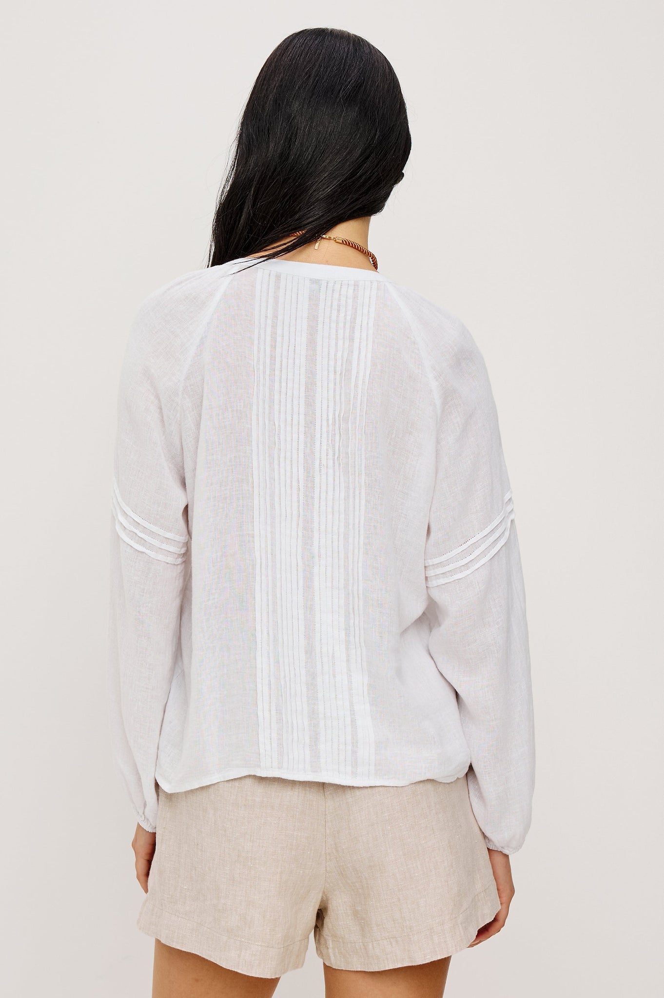 Made from luxe, lightweight linen, the Naples Top features a split V-neck with self-ties, long billowing sleeves with fitted cuffs, a loose, flowing silhouette, and intricate seam detailing.
