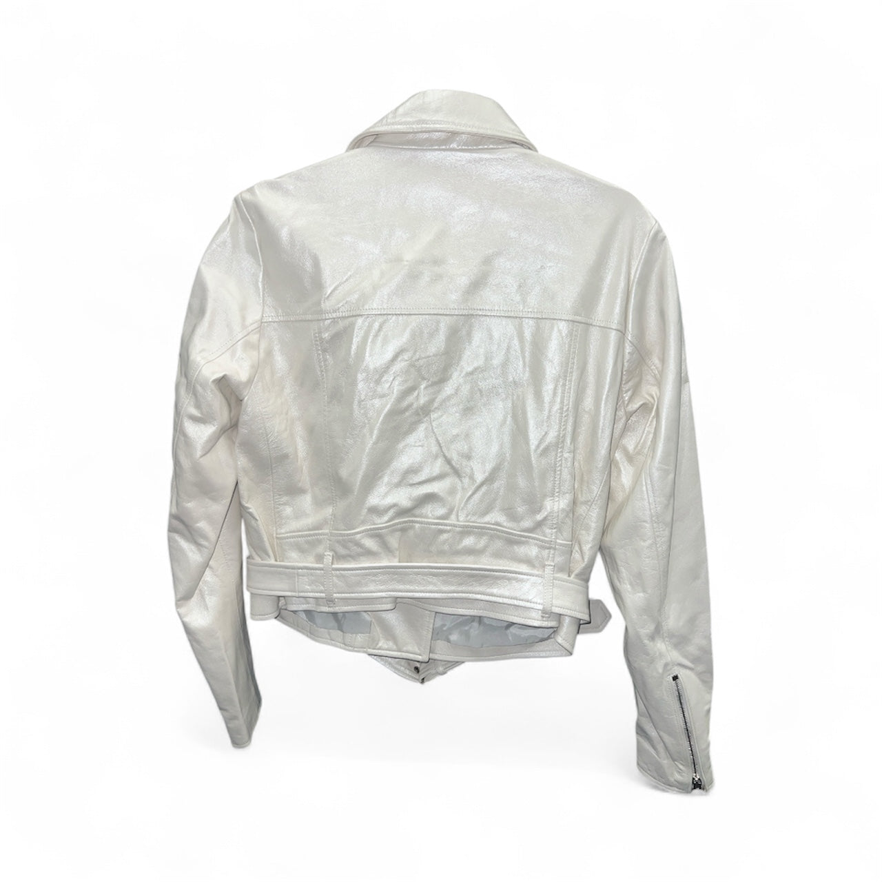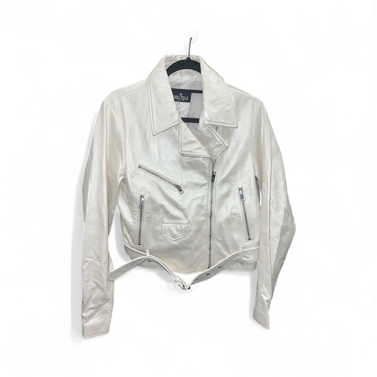 Crafted from luxurious Nappa Perlata leather in a refined Latte shade, this Vera Pelle Iridescent Motorcycle Jacket combines timeless elegance with rugged edge. Its supple texture and subtle iridescent finish offer sophisticated style, while tailored construction ensures a flattering fit and lasting comfort. Perfect for those who appreciate high-quality craftsmanship and understated luxury in their outerwear.