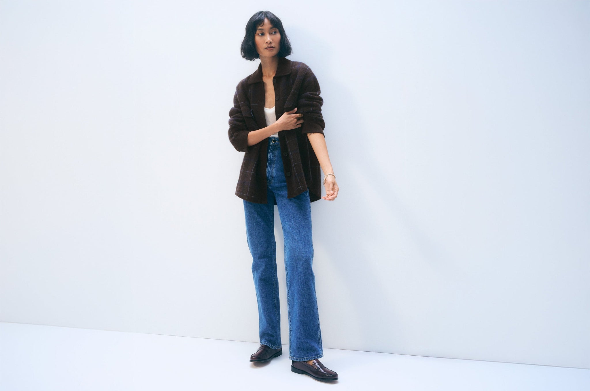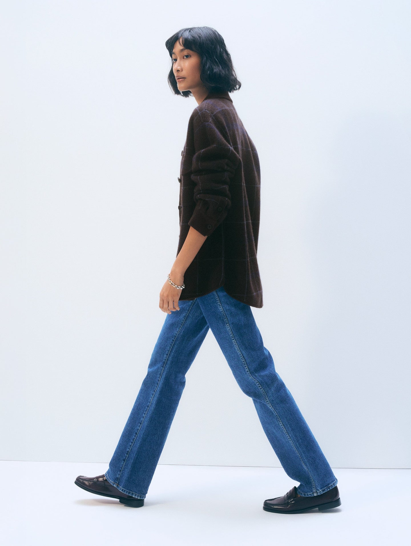 Polished and versatile. Crafted from 100% cashmere in a windowpane plaid, this structured, oversized layer features buttoned pockets and cuffs for functional style.