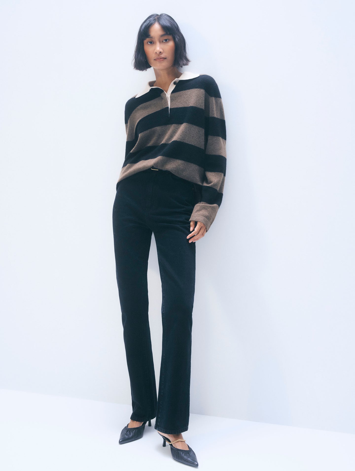 A modern take on the traditional rugby, this long-sleeved sweater is knit from 100% cashmere. Its elongated, relaxed fit is elevated with bold, horizontal stripes and a contrast collar for a polished, sporty feel.