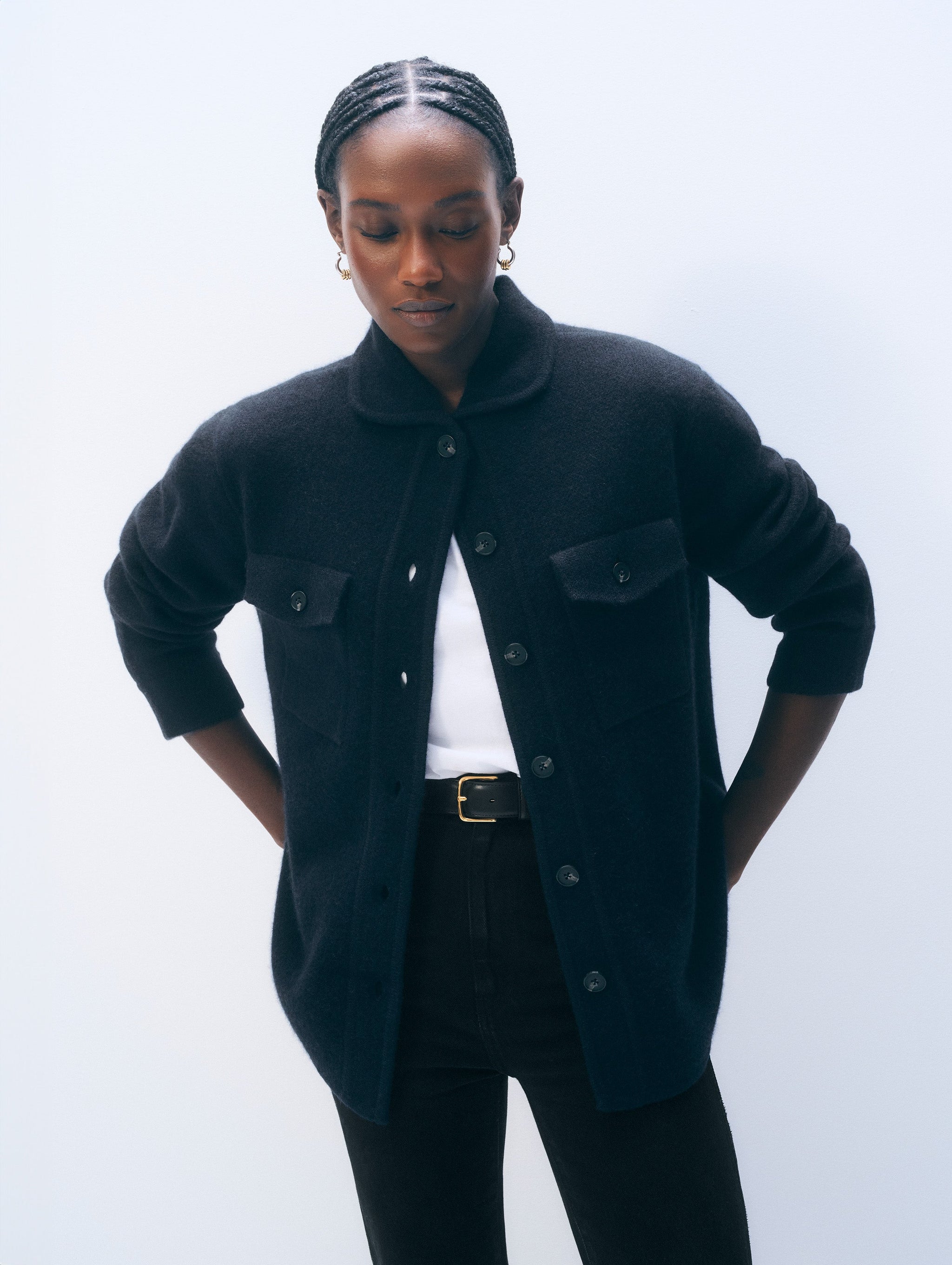 Polished and versatile. Crafted from 100% cashmere this structured, oversized layer features buttoned pockets and cuffs for functional style.